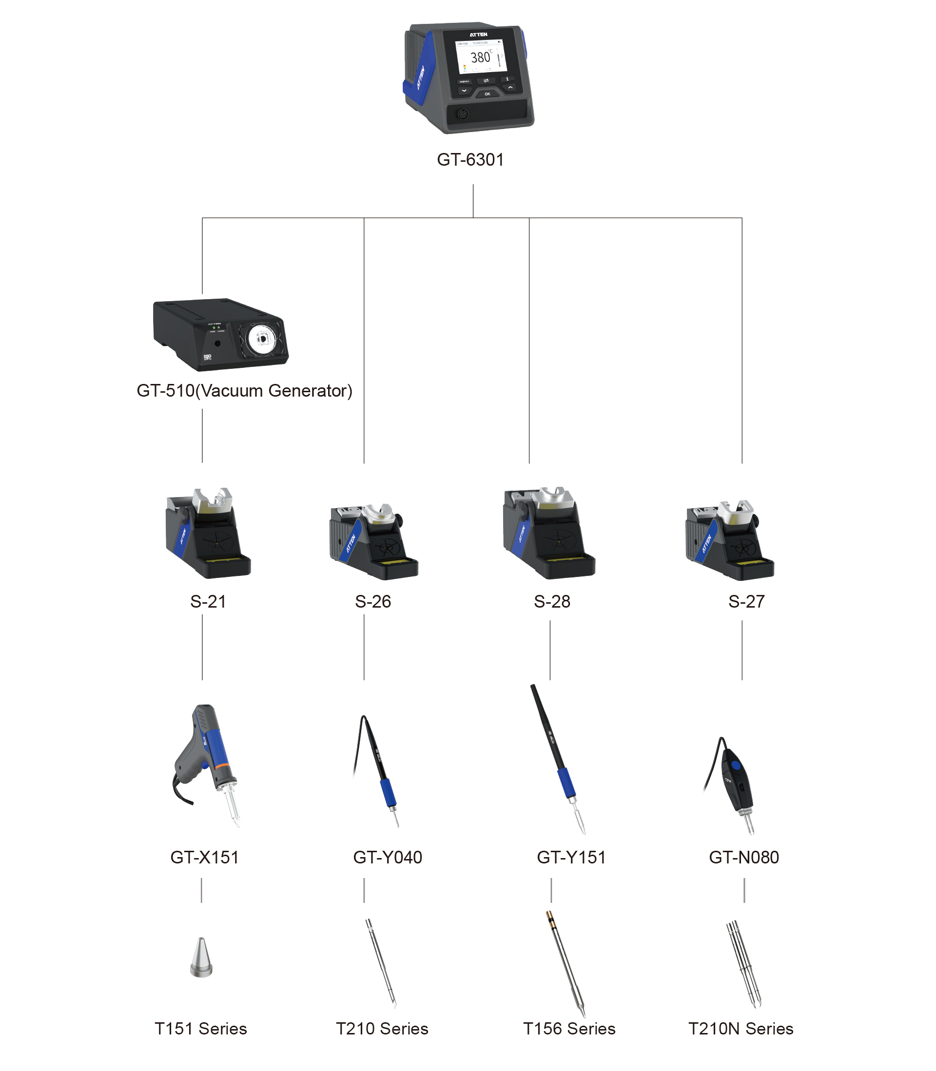 The GT-6301 soldering system incorporates a modular design enabling straightforward maintenance and component replacement, maximizing uptime in professional settings. Its TFT large screen interface is engineered for clear visibility and intuitive navigation, enhancing operator efficiency. The structure emphasizes durability with materials resistant to thermal and mechanical wear, supporting prolonged usage cycles. Integration of auxiliary tools such as solder suction and cleaning kits within the package reflects a comprehensive solution approach typical of the best professional soldering iron systems produced by reputable brands like ATTEN soldering tool.