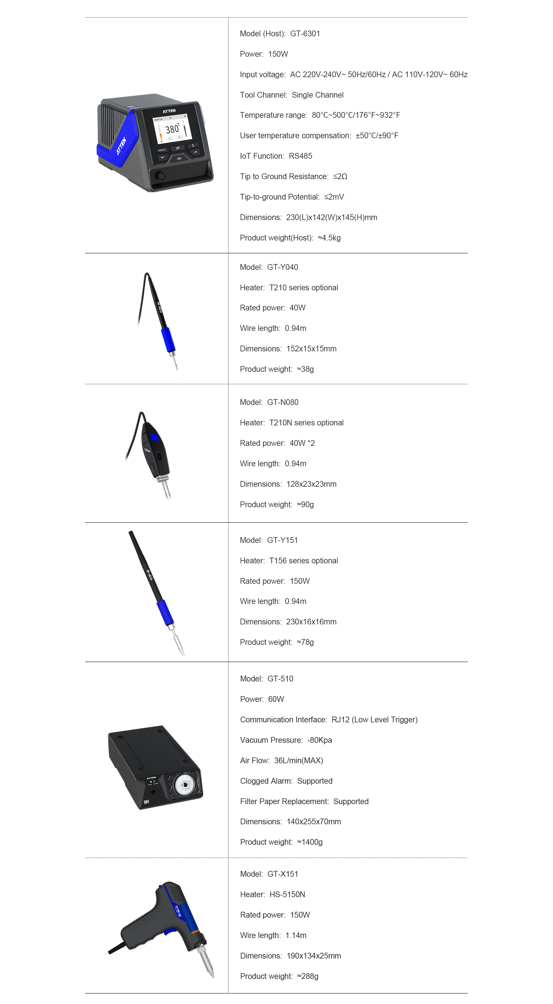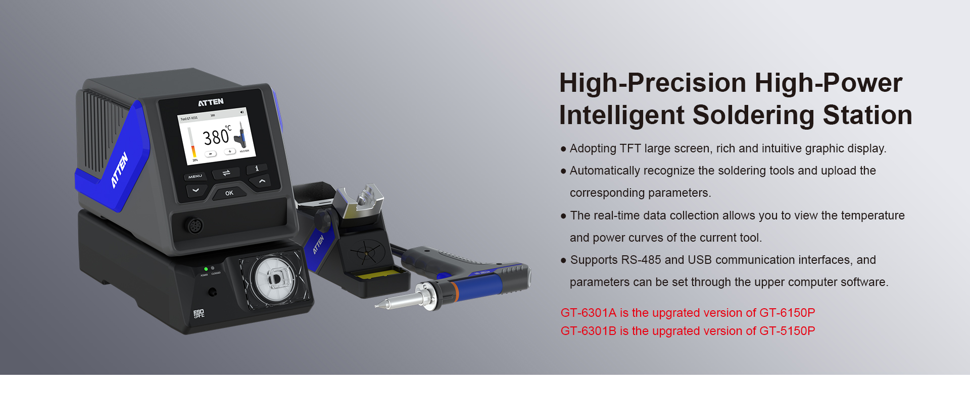 The GT-6301 intelligent soldering station is engineered to meet the demands of engineering teams and technicians requiring exceptional precision and ease of use. Designed to support complex soldering tasks, this ATTEN soldering tool enhances application accuracy and process repeatability. Its user-oriented interface allows seamless integration into production lines or R&D labs focused on electronics assembly and prototyping. This solution targets professional users who require consistent quality and reliability from the best professional soldering iron while maintaining workflow efficiency in high-volume or intricate soldering environments.
